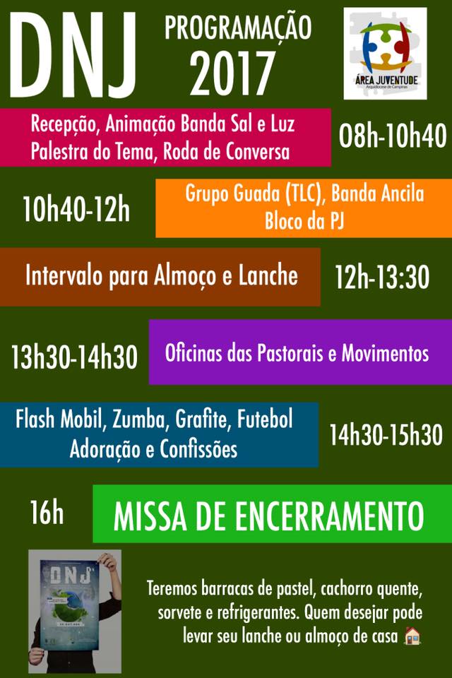 O Grupo de Jovens, Guerreiros de Fé está organizando a ida dos jovens da Paróquia São João Batista para participar do Dia Nacional da Juventude (DNJ) 2017. Aqueles que estiverem interessados, entrarem em contato para maiores informações com o coordenador do grupo, José Eduardo pelo telefone (19) 98132-7682 até a segunda-feira (23/10).
